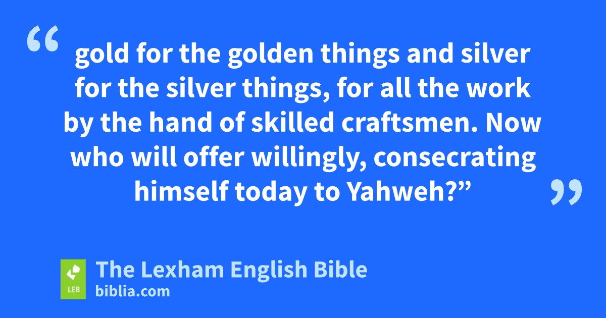 29 Then David the king said to all the assembly, “God has chosen Solomon my son alone, a young man and inexperienced, and the work is great, for the citadel is not for humankind, but for Yahweh God. 2 So I have provided for the house of my God according to all my strength, the gold for the things of gold, the silver for the things of silver, the bronze for the things of bronze, the iron for the things of iron, and the wood for the things of wood, along with an abundance of onyx stones, stones for settings, stones of turquoise, and variegated stones, and all kinds of precious stones and alabaster stones. 3 And moreover, with respect to my provisions for the house of my God I have a treasure of gold and silver that I have given to the house of my God above all that I have provided for the holy house: 4 three thousand talents of gold from the gold of Ophir and seven thousand talents of refined silver to overlay the walls of the houses, 5 gold for the golden things and silver for the silver things, for all the work by the hand of skilled craftsmen. Now who will offer willingly, ⌊consecrating himself⌋a today to Yahweh?”