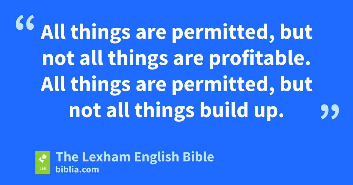23 All things are permitted, but not all things are profitable. All things are permitted, but not all things build up. 24 Let no one seek ⌊his own good⌋b but the good of the other. 25 Eat everything that is sold in the meat market, ⌊asking no questions⌋c for the sake of the conscience, 26 for “the earth is the Lord’s, and its fullness.”d 27 If any of the unbelievers invites you, and you want to go, eat everything that is set before you, ⌊asking no questions⌋e for the sake of the conscience. 28 But if someone says to you, “This is offered to idols,” do not eat it, for the sake of that one who informed you and the conscience. 29 Now I am not speaking about your own conscience, but the conscience of the other person. For why is my freedom judged by another’s conscience? 30 If I partake with thankfulness, why am I slandered concerning that for which I give thanks?