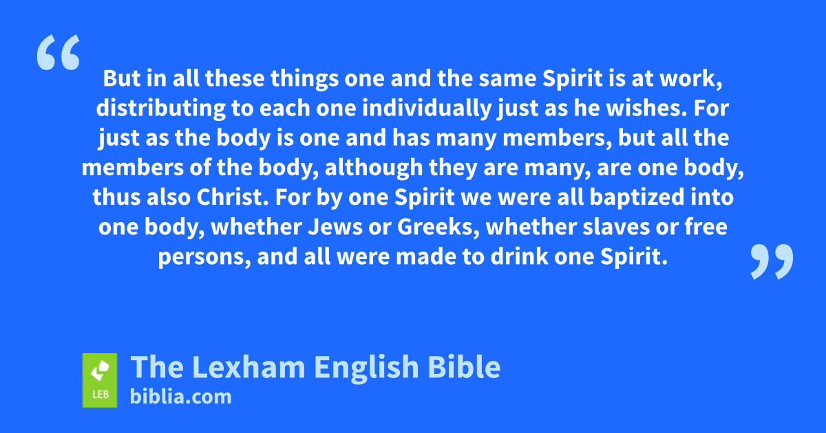12 For just as the body is one and has many members, but all the members of the body, although they* are many, are one body, thus also Christ. 13 For byh one Spirit we were all baptized into one body, whether Jews or Greeks, whether slaves or free persons, and all were made to drink one Spirit. 14 For the body is not one member, but many. 15 If the foot should say, “Because I am not a hand, I am not a part of the body,” not because of this is it not a part of the body. 16 And if the ear should say, “Because I am not an eye, I am not a part of the body,” not because of this is it not a part of the body. 17 If the whole body were an eye, where would the hearing be? If the whole were hearing, where would the sense of smell be? 18 But now God has placed the members, each one of them, in the body just as he wanted. 19 And if they all were one member, where would the body be? 20 But now there are many members, but one body.