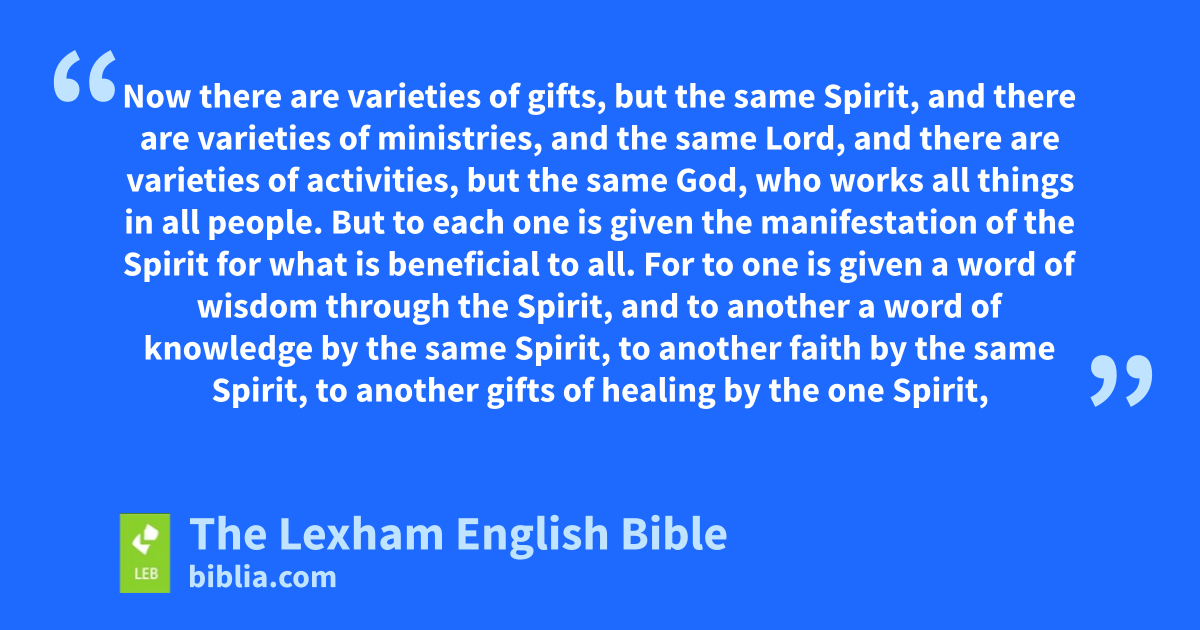 4 Now there are varieties of gifts, but the same Spirit, 5 and there are varieties of ministries, and the same Lord, 6 and there are varieties of activities, but the same God, who works all things in all people. 7 But to each one is given the manifestation of the Spirit for what is beneficial to all. 8 For to one is given a word of wisdom through the Spirit, and to another a word of knowledge by the same Spirit, 9 to another faith by the same Spirit, to anotherb gifts of healing by the one Spirit, 10 to anotherc ⌊miraculous powers⌋d, to anothere prophecy, to anotherf distinguishing of spirits, to another kinds of tongues, to anotherg interpretation of tongues. 11 But in all these things one and the same Spirit is at work, distributing to each one individually just as he wishes.