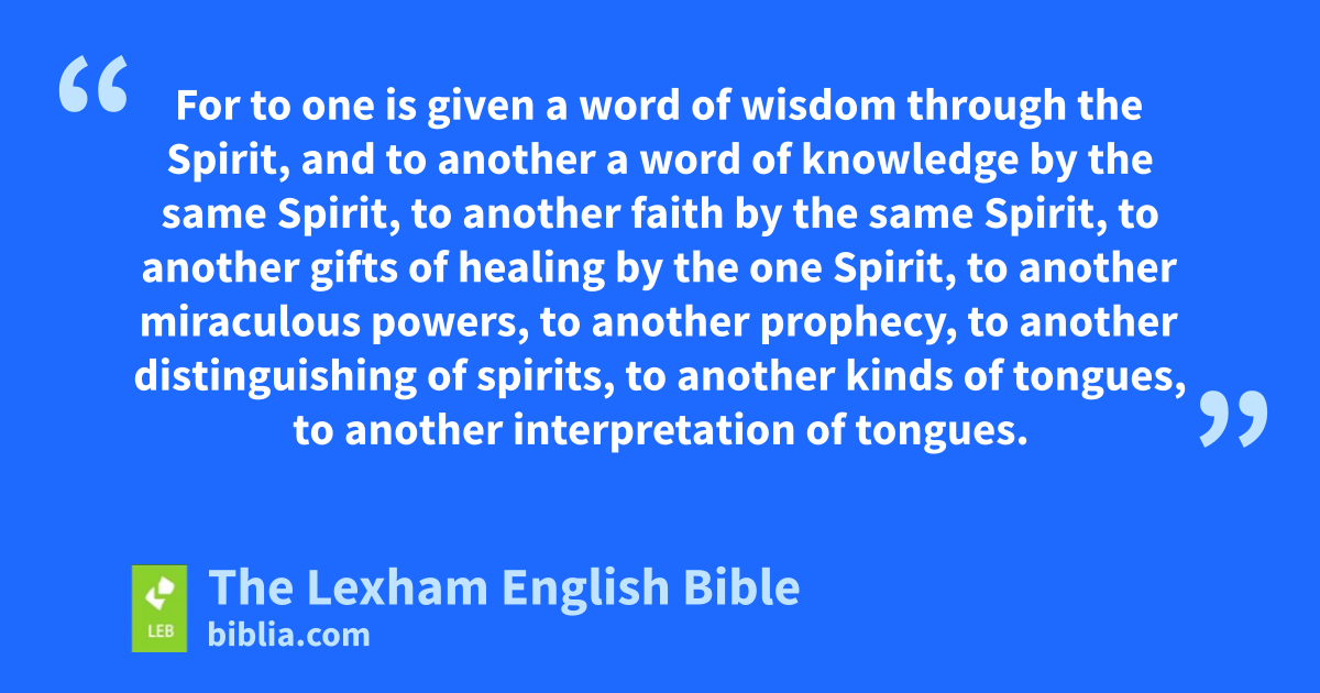 4 Now there are varieties of gifts, but the same Spirit, 5 and there are varieties of ministries, and the same Lord, 6 and there are varieties of activities, but the same God, who works all things in all people. 7 But to each one is given the manifestation of the Spirit for what is beneficial to all. 8 For to one is given a word of wisdom through the Spirit, and to another a word of knowledge by the same Spirit, 9 to another faith by the same Spirit, to anotherb gifts of healing by the one Spirit, 10 to anotherc ⌊miraculous powers⌋d, to anothere prophecy, to anotherf distinguishing of spirits, to another kinds of tongues, to anotherg interpretation of tongues. 11 But in all these things one and the same Spirit is at work, distributing to each one individually just as he wishes.
