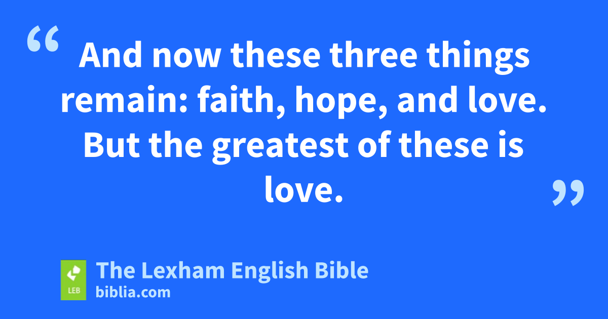8 Love never ends. But if there are prophecies, they will pass away. If there are tongues, they will cease. If there is knowledge, it will pass away. 9 For we know in part and we prophesy in part, 10 but whenever the perfect comes, the partial will pass away. 11 When I was a child, I spoke like a child, I thought like a child, I reasoned like a child. When I became a man, I set aside the things of a child. 12 For now we see through a mirror ⌊indirectly⌋c, but then face to face. Now I know in part, but then I will know completely, just as I have also been completely known. 13 And now these three things remain: faith, hope, and love. But the greatest of these is love.