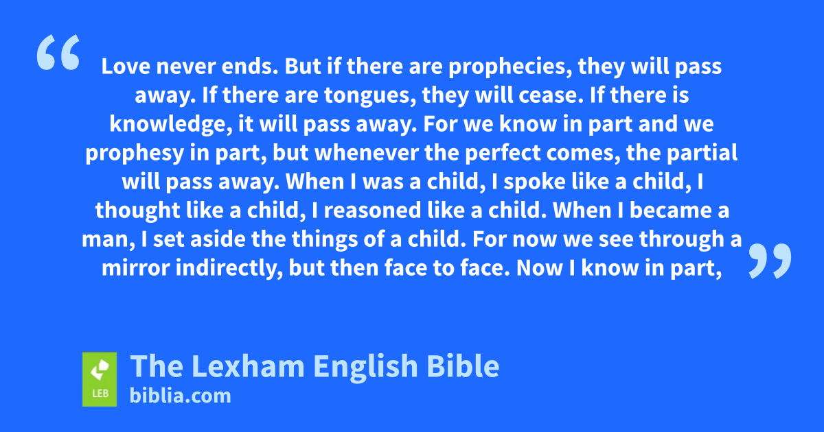 8 Love never ends. But if there are prophecies, they will pass away. If there are tongues, they will cease. If there is knowledge, it will pass away. 9 For we know in part and we prophesy in part, 10 but whenever the perfect comes, the partial will pass away. 11 When I was a child, I spoke like a child, I thought like a child, I reasoned like a child. When I became a man, I set aside the things of a child. 12 For now we see through a mirror ⌊indirectly⌋c, but then face to face. Now I know in part, but then I will know completely, just as I have also been completely known. 13 And now these three things remain: faith, hope, and love. But the greatest of these is love.