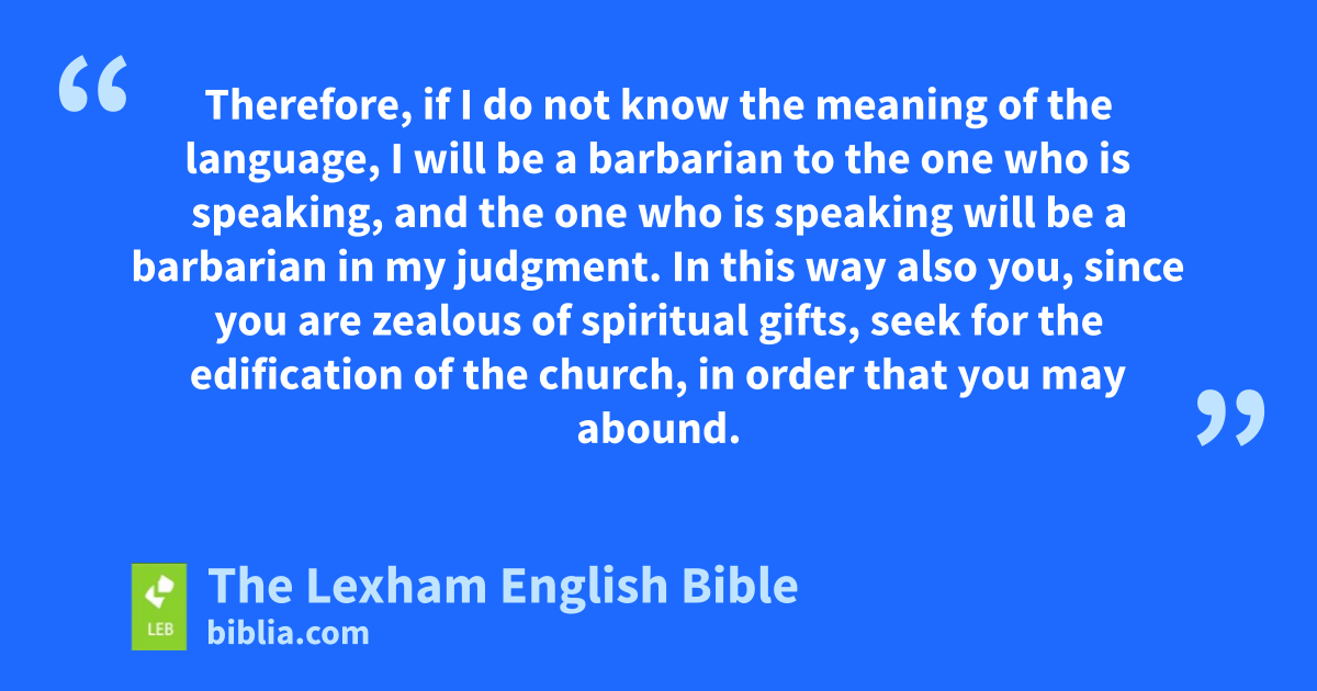 6 But now, brothers, if I come to you speaking with tongues, how do I benefit you, unless I speak to you either with a revelation or with knowledge or with a prophecy or with a teaching? 7 Likewise, the inanimate things which produce a sound, whether flute or lyre, if they do not produce a distinction in the tones, how will it be known what is played on the flute or on the lyre? 8 For indeed, if the trumpet produces an indistinct sound, who will prepare for battle? 9 And so you through the tongue, unless you produce a clear message, how will it be known what is spoken? For you will be speaking into the air. 10 There are probably so many kinds of languages in the world, and none without meaning. 11 Therefore, if I do not know the meaning of the language, I will be a barbarian to the one who is speaking, and the one who is speaking will be a barbarian in my judgment. 12 In this way also you, since you are zealous of spiritual gifts, seek for the edification of the church, in order that you may abound.