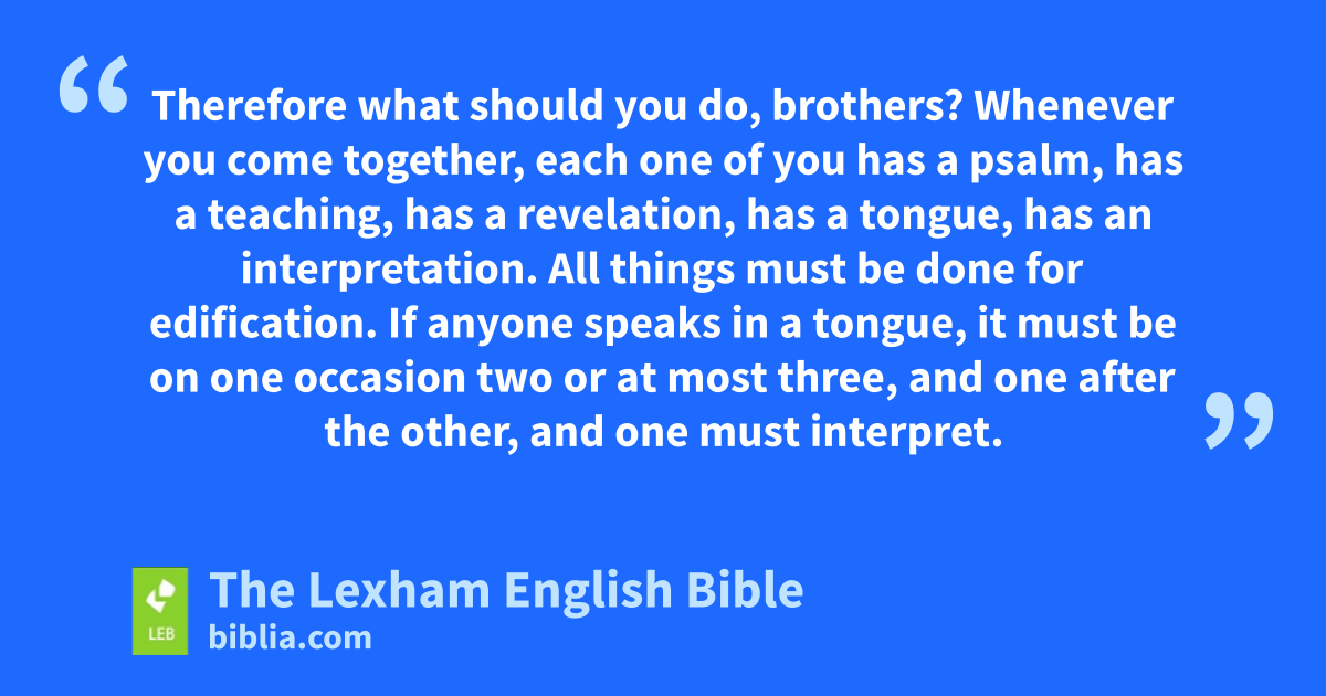 26 ⌊Therefore what should you do⌋d, brothers? Whenever you come together, each one of you has a psalm, has a teaching, has a revelation, has a tongue, has an interpretation. All things must be done for edification. 27 If anyone speaks in a tongue, it must be on one occasion two or at most three, and ⌊one after the other⌋e, and one must interpret. 28 But if there is no interpreter, he must be silent in the church, but let him speak to himself and to God. 29 Let two or three prophets speak, and the others evaluate. 30 And if something is revealed to another who is seated, the first must be silent. 31 For you are all able to prophesy ⌊in turn⌋f, in order that all may learn and all may be encouraged, 32 and the spirits of prophets are subject to prophets. 33 For God is not a God of disorder but of peace.