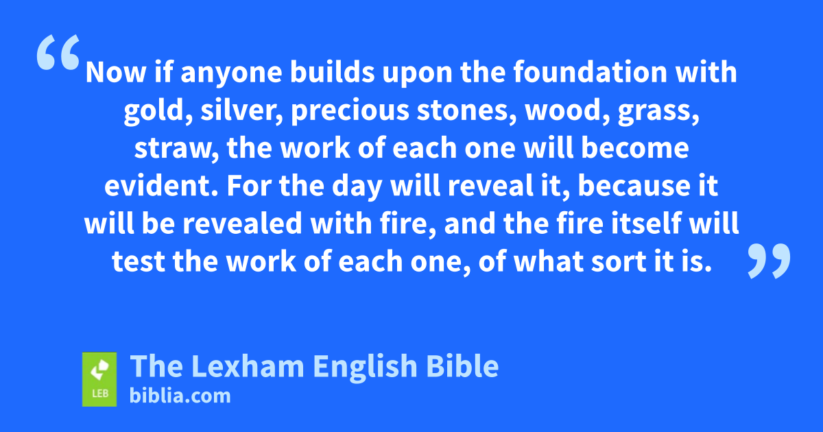 10 According to the grace of God given to me, like a skilled master builder I laid a foundation, and another is building upon it. But each one must direct his attention to how he is building upon it. 11 For no one is able to lay another foundation than the one which is laid, which is Jesus Christ. 12 Now if anyone builds upon the foundation with gold, silver, precious stones, wood, grass, straw, 13 the work of each one will become evident. For the day will reveal it, because it will be revealed with fire, and the fire itself will test the work of each one, of what sort it is. 14 If anyone’s work that he has built upon it remains, he will receive a reward. 15 If anyone’s work is burned up, he will suffer loss, but he himself will be saved, but so as through fire.