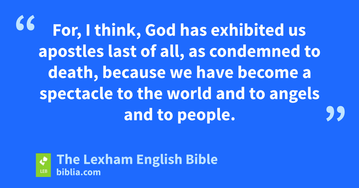 6 Now I have applied these things, brothers, to myself and Apollos for your sake, in order that in us you may learn not to go beyond what is written, lest someone be inflated with pride on behalf of one person against the other. 7 For who concedes you superiority? And what do you have that you did not receive? But if indeed you received it, why do you boast as if you* did not receive it? 8 Already you are satiated! Already you are rich! Apart from us you reign as kings! And would that indeed you reigned as kings, in order that we also might reign as kings with you! 9 For, I think, God has exhibited us apostles last of all, as condemned to death, because we have become a spectacle to the world and to angels and to people. 10 We are fools for the sake of Christ, but you are prudent in Christ! We are weak, but you are strong! You are honored, but we are dishonored! 11 Until the present hour we are both hungry and thirsty and poorly clothed and roughly treated and homeless, 12 and we toil, working with our own hands. When we are* reviled, we bless; when we are* persecuted, we endure; 13 when we are* slandered, we encourage. We have become like the refuse of the world, the offscouring of all things, until now.