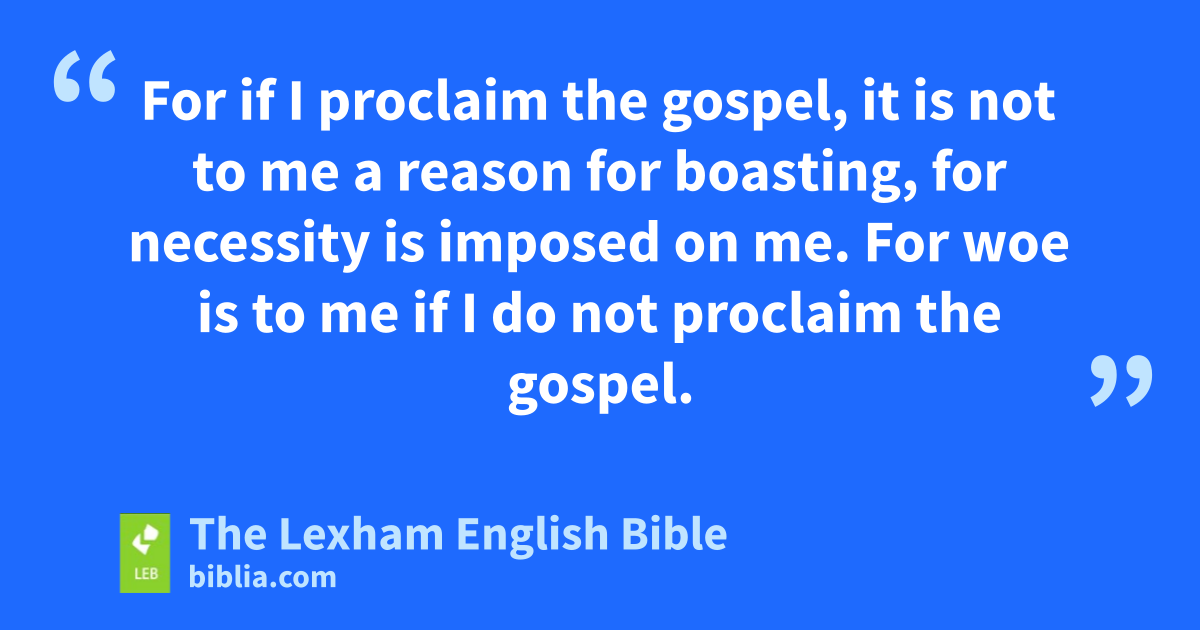 13 Do you not know that those performing the holy services eat the things from the temple, and those attending to the altar have a share with the altar? 14 In the same way also the Lord ordered those who proclaim the gospel to live from the gospel. 15 But I have not made use of any of these rights. And I am not writing these things in order that it may be thus with me. For it would be better to me rather to die than for anyone to deprive me of my reason for boasting. 16 For if I proclaim the gospel, it is not to me a reason for boasting, for necessity is imposed on me. For woe is to me if I do not proclaim the gospel. 17 For if I do this voluntarily, I have a reward, but if I do so unwillingly, I have been entrusted with a stewardship. 18 What then is my reward? That when I* proclaim the gospel, I may offer the gospel free of charge, in order not to make full use of my right in the gospel.