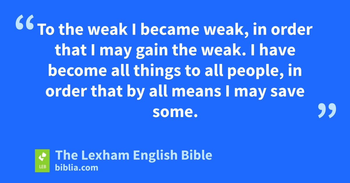 19 For although I* am free from all people, I have enslaved myself to all, in order that I may gain more. 20 I have become like a Jew to the Jews, in order that I may gain the Jews. To those under the law I became as under the law (although I* myself am not under the law) in order that I may gain those under the law. 21 To those outside the law I became as outside the law (although I* am not outside the law of God, but subject to the law of Christ) in order that I may gain those outside the law. 22 To the weak I became weak, in order that I may gain the weak. I have become all things to all people, in order that by all means I may save some. 23 I do all this for the sake of the gospel, in order that I may become a participant with it.