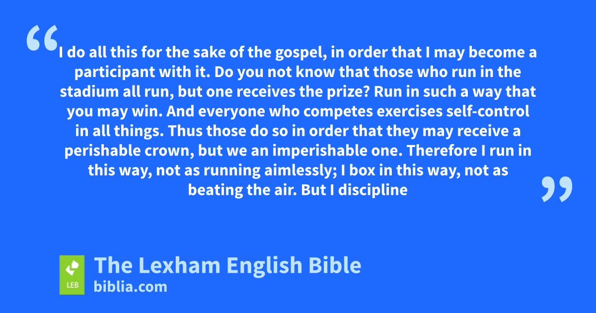 24 Do you not know that those who run in the stadium all run, but one receives the prize? Run in such a way that you may win. 25 And everyone who competes exercises self-control in all things. Thus those do so in order that they may receive a perishable crown, but we an imperishable one. 26 Therefore I run in this way, not as running aimlessly; I box in this way, not as beating the air. 27 But I discipline my body and subjugate it, lest somehow after* preaching to others, I myself should become disqualified.
