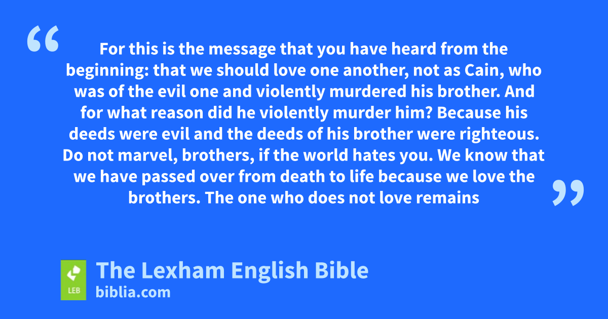 11 For this is the message that you have heard from the beginning: that we should love one another, 12 not as Cain, who was of the evil one and violently murdered his brother. And ⌊for what reason⌋a did he violently murder him? Because his deeds were evil and the deeds of his brother were righteous.