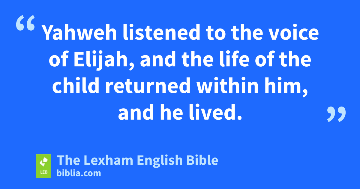 17 It happened after these things that the son of the woman, the mistress of the house, became ill; and his illness was very severe until there was no breath left in him. 18 She said to Elijah, “⌊What do you have against me⌋,m O man of God, that you have come to me to make known my guilt and to cause my son to die?” 19 Then he said to her, “Give me your son.” He took him from her lap and carried him up to the upper room where he was staying, and he laid him on his bed. 20 Then he called to Yahweh and said, “O Yahweh my God, are you also causing evil to come upon the widow with whom I am dwelling as an alien by causing her son to die?” 21 He stretched himself out on the child three times and called to Yahweh and said, “O Yahweh my God, please let the life of this child return within him.” 22 Yahweh listened to the voice of Elijah, and the life of the child returned within him, and he lived. 23 Elijah then took the child and brought him down from the upper room to the house and gave him to his mother. Elijah said, “Look, your son is alive.” 24 Then the woman said to Elijah, “Now this I know, that you are a man of God and the word of Yahweh in your mouth is truth.”