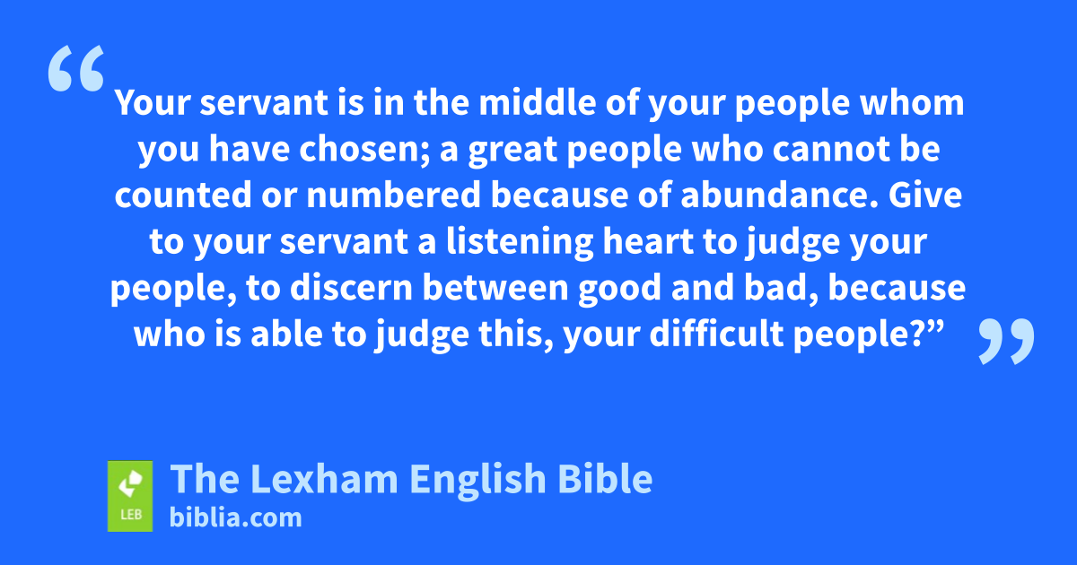 5 Yahweh appeared to Solomon at Gibeon in a dream at night, and God said, “Ask what I should give to you.” 6 Then Solomon said, “You have shown great loyal love with your servant David my father, as he walked before you in faithfulness and in righteousness and in uprightness of heart with you. You have shown for him this great loyal love, and you have given a son to him who is sitting on his throne as it is this day. 7 So then, O Yahweh, you are my God. You have made your servant king in place of David my father though I am a young boy. I do not know going out or coming in. 8 Your servant is in the middle of your people whom you have chosen; a great people who cannot be counted or numbered because of abundance. 9 Give to your servant a listening heart to judge your people, to discern between good and bad, because who is able to judge this, your difficult people?”