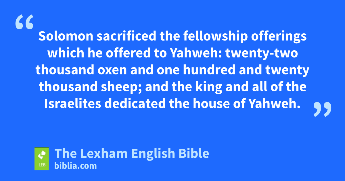 62 Then the king and all of Israel with him offered a sacrifice in the presence of Yahweh. 63 Solomon sacrificed the fellowship offerings which he offered to Yahweh: twenty-two thousand oxen and one hundred and twenty thousand sheep; and the king and all of the ⌊Israelites⌋b dedicated the house of Yahweh. 64 On that day the king consecrated the middle of the courtyard before the house of Yahweh because he offered there the burnt offerings, the grain offerings, and the fat of the fellowship offerings because the bronze altar that was in the presence of Yahweh was too small to hold the burnt offerings and the grain offerings and the fat of the fellowship offerings. 65 Solomon held the festival at that time and all of Israel with him, a great assembly from Lebo Hamath up to the wadic of Egypt before Yahweh our God, for seven days and seven days, a total of fourteen days. 66 On the eighth day, he sent the people away, and they blessed the king, and they went to their tents rejoicing and ⌊in good spirits⌋d because of all the goodness that Yahweh had shown to David his servant and to Israel his people.