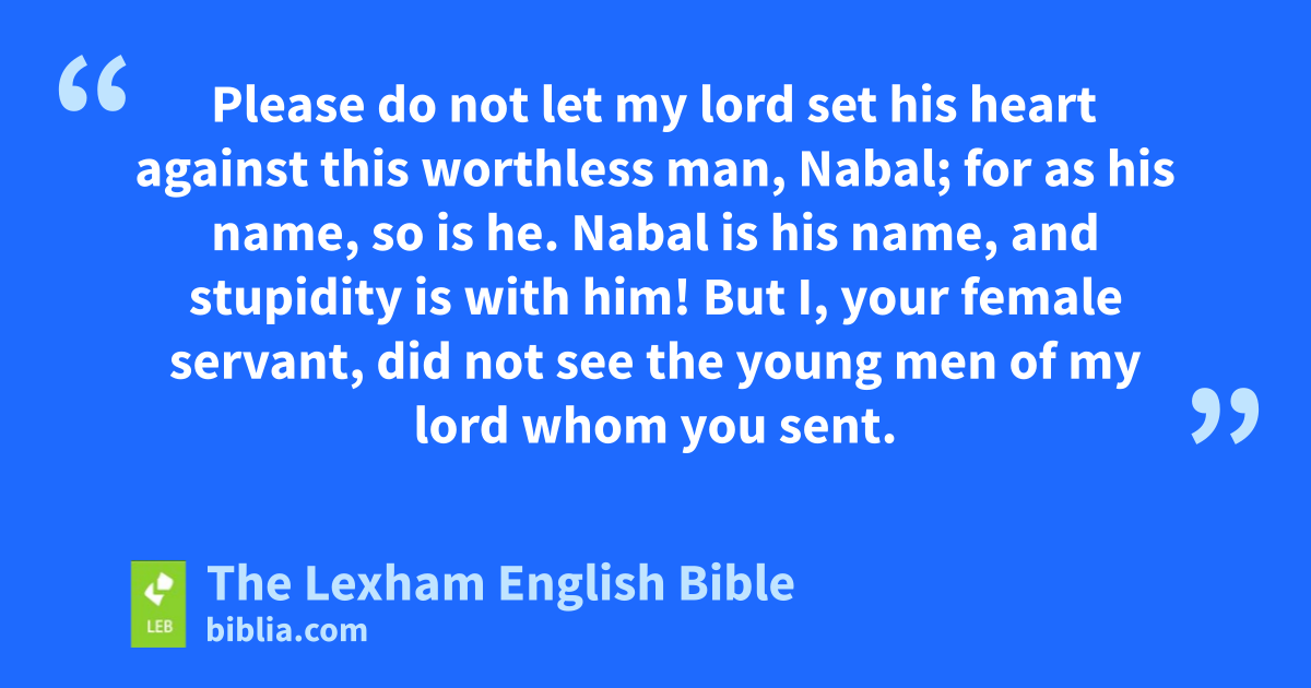 18 Then Abigail ⌊quickly took⌋s two hundred loaves of bread, two skins of wine, five prepared sheep, five seahs of roasted grain, a hundred raisin cakes, and two hundred fig cakes, and she put them on the donkeys. 19 Then she said to her servants, “Go ahead before me; look, I am coming after you,” but she did not tell her husband Nabal. 20 ⌊And then⌋,t as she was riding on the donkey and was going down the ravine of the mountain, David and his men were coming down to meet her, and she met them. 21 Now David had said, “Surely ⌊in vain⌋u I guarded all that this fellow had in the desert. And nothing was missed of all that was his, but he returned evil against me in place of good! 22 ⌊May God severely punish the enemies of David⌋v and again do thus if I leave behind ⌊anything that is his⌋w until the morning, not even ⌊one male⌋!”x 23 When Abigail saw David, she hurried and got down from the donkey and fell on her face before ⌊David’s anger⌋,y and she bowed down to the ground. 24 She fell at his feet and said, “On me, my lord, be the guilt! Please let your female servant speak ⌊to you personally⌋!z Hear the words of your female servant! 25 Please do not let my lord set his heart against ⌊this worthless man⌋,a Nabal; for as his name, so is he. Nabal is his name, and stupidity is with him! But I, your female servant, did not see the young menb of my lord whom you sent. 26 So then, my lord, ⌊as Yahweh lives and as your soul lives⌋,c since Yahweh restrained you from bloodguilt ⌊by taking matters into your own hand⌋,d so then, may your enemies be like Nabal, even ⌊those who seek to do my lord harm⌋.e 27 So then, this gift which your female servant has brought to my lord, may it be given to the young men ⌊who follow my lord⌋.f 28 Please forgive the transgression of your female servant, because Yahweh will certainly make a lasting houseg for my lord, because my lord is fighting the battles of Yahweh, and evil will not be found in you ⌊as long as you live⌋.h 29 Should a man arise to pursue you and to seek your life, may the life of my lord be wrapped in the pouchi of the living with Yahweh your God. But as for the life of your enemy, he will sling it from withinj the pocket of the sling! 30 ⌊And then⌋k when Yahweh has done for my lord according to all the good that he has spoken concerning you, and has appointed you as leader over Israel, 31 then this will not be an obstacle for you or a stumbling block of conscience for my lord either by the shedding of blood without cause or by ⌊my lord taking matters into his own hands⌋.l And when Yahweh does good to my lord, then remember your female servant.”
