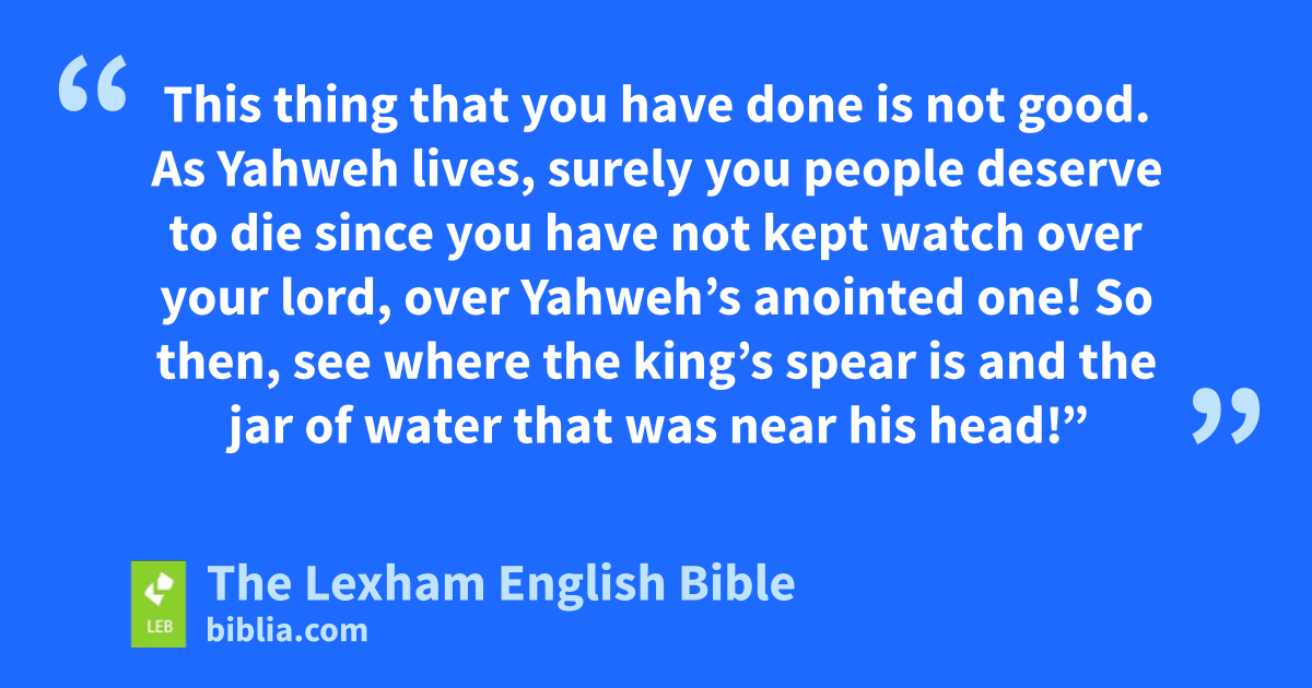 13 Then David went to the other side and stood on the top of the hill at a distance; the distance was great between them. 14 David called out to the army and to Abner the son of Ner, “Will you not answer, Abner?” And Abner answered and said, “Who are you that you call to the king?” 15 So David said to Abner, “Are you not a man? And who is like you in Israel? Why did you not keep watch over your lord the king? For one of the people came to destroyn your lord the king. 16 This thing that you have done is not good. ⌊As Yahweh lives⌋,o ⌊surely you people deserve to die⌋p since you have not kept watch over your lord, over Yahweh’s anointed one! So then, see where the king’s spear is and the jar of water that was near his head!” 17 Then Saul recognized David’s voice and said, “Is this your voice, my son David?” And David said, “It is my voice, my lord the king.” 18 Then he said, “Why is my lord pursuing after his servant? For what have I done? And what evil is in my hand? 19 And so then, please let my lord the king listen to the words of his servant: If Yahweh has incited you against me, may he delight in an offering; but if ⌊it is mortals⌋,q may they be accursed ⌊before⌋r Yahweh, for they have driven me away today from sharing in the inheritance of Yahweh, saying, ‘Go, serve other gods!’ 20 And so then, do not let my blood fall to the ground ⌊away from⌋s the presence of Yahweh, for the king of Israel has gone out to seek a single flea, as one hunts a partridge in the mountains.”