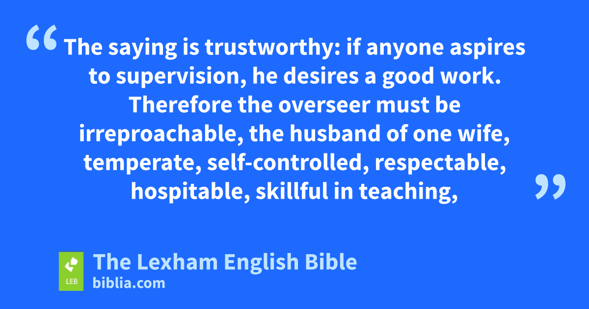 3 The saying is trustworthy: if anyone aspires to supervision, he desires a good work. 2 Therefore the overseer must be irreproachable, the husband of one wife, temperate, self-controlled, respectable, hospitable, skillful in teaching, 3 not addicted to wine, not a violent person, but gentle, peaceable, not loving money, 4 managing his own household well, having children in submission with all dignity 5 (but if someone does not know how to manage his own household, how will he take care of the church of God?), 6 not newly converted, lest he become conceited and fall into the condemnation of the devil. 7 But he must also have a good testimony from those outside, in order that he may not fall into disgrace and the trap of the devil.