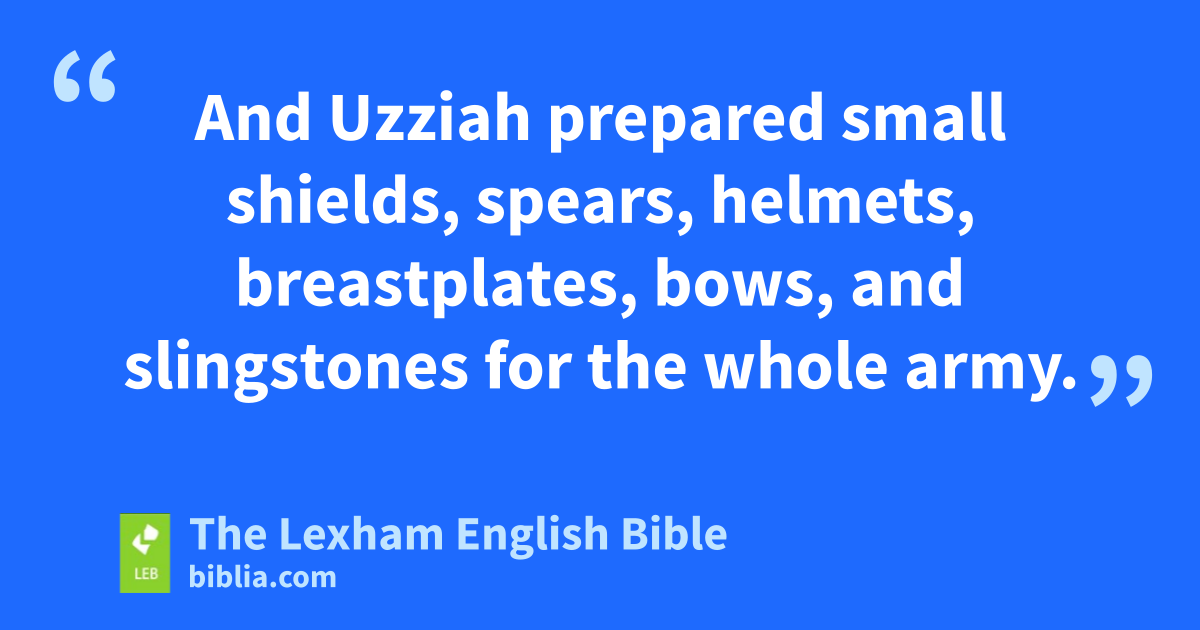 6 And he went out and made war against the Philistines, and he broke down the wall of Gath and the wall of Jabneh and the wall of Ashdod, and he built cities in Ashdod and among the Philistines. 7 And God helped him against the Philistines and against the Arabs who were living in Gur-Baal and Meunim. 8 And the Ammonites gave tribute to Uzziah, and his famef went out to the boundaryg of Egypt, for he became ⌊very strong⌋.h 9 And Uzziah built towers in Jerusalem at the Corner Gate, at the Valley Gate, and at the Angle, and he strengthened them. 10 And he built towers in the desert and hewed many cisterns, for he had much livestock, both in the Shephelah and on the plain, along with farmers and vinedressers in the hills and in the fertile lands, for he loved the soil. 11 And Uzziah had troops ⌊trained and ready for war⌋i in divisions according to the number of their enrollment at the hand of Jeuel the scribe and Maaseiah the officer, under the hand of Hananiah of the king’s commanders. 12 The whole number of the heads of the ⌊families⌋j for mighty warriors of strength was two thousand six hundred. 13 And under their hand were army troops numbering three hundred and seven thousand five hundred who could make war with power and strength to help the king against an enemy. 14 And Uzziah prepared small shields, spears, helmets, breastplates, bows, and slingstones for the whole army. 15 And he made siege machines in Jerusalem designed by skillful men to be set upon the towers and upon the corners to shoot arrows and large slingstones. And his famek went out far, for he was helped marvelously until he was strong.