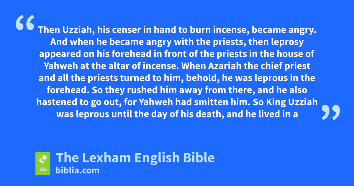 16 But on account of his strength his heart grew proud unto destruction. And he acted unfaithfully against Yahweh his God and went into the temple of Yahweh to offer an incense offering on the altar. 17 And Azariah the priest, and eighty ⌊strong⌋l priests of Yahweh with him, went in after him. 18 And they stood against King Uzziah and said to him, “It is not for you, Uzziah, to burn incense to Yahweh, but it is for the priests, the descendantsm of Aaron, who are consecrated to burn incense. Go out of the sanctuary, for you have acted unfaithfully. There will be no honor for you from Yahweh God.” 19 Then Uzziah, his censer in hand to burn incense, became angry. And when he became angry with the priests, then leprosy appeared on his forehead in front of the priests in the house of Yahweh at the altar of incense. 20 When Azariah the chief priest and all the priests turned to him, behold, he was leprous in the forehead. So they rushed him away from there, and he also hastened to go out, for Yahweh had smitten him. 21 So King Uzziah was leprous until the day of his death, and he lived in a separate house as a leper, for he was cut off from the house of Yahweh. And Jotham his son was over the house of the king, judging the people of the land.