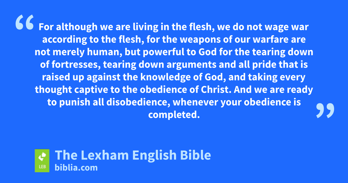 10 Now I, Paul, appeal to you myself by the humility and gentleness of Christ, who ⌊when I am present in person⌋a am humble among you, but when I* am absent am bold toward you—2 now I ask when I* am present that I will not need to be bold with the confidence with which I propose to show boldness toward some who consider us as behaving according to the flesh. 3 For although we* are living in the flesh, we do not wage war according to the flesh, 4 for the weapons of our warfare are not merely human, but powerful to God for the tearing down of fortresses, tearing down arguments 5 and all pride that is raised up against the knowledge of God, and taking every thought captive to the obedience of Christ. 6 And ⌊we are ready⌋b to punish all disobedience, whenever your obedience is completed.