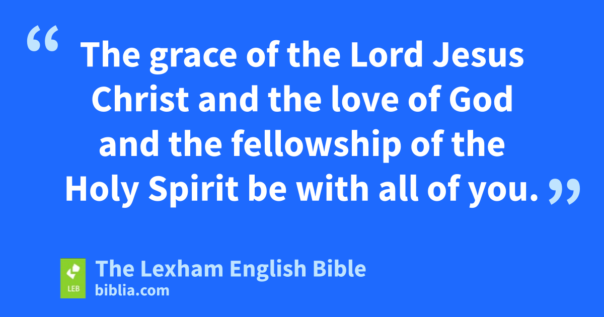 11 Finally, brothers, rejoice, be restored, be encouraged, ⌊be in agreement⌋c, be at peace, and the God of love and peace will be with you. 12 Greet one another with a holy kiss. All the saints greet you. 13 The grace of the Lord Jesus Christ and the love of God and the fellowship of the Holy Spirit be with all of you.