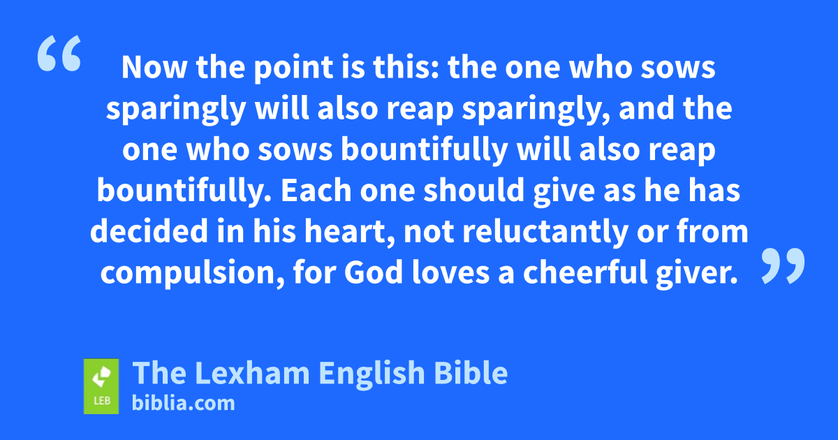 6 Now the point is this: the one who sows sparingly will also reap sparingly, and the one who sows bountifully will also reap bountifully. 7 Each one should give as he has decided in his heart, not ⌊reluctantly⌋b or from compulsion, for God loves a cheerful giver. 8 And God is able to cause all grace to abound to you, so that in everything at all times, because you* have enough of everything, you may overflow in every good work. 9 Just as it is written,