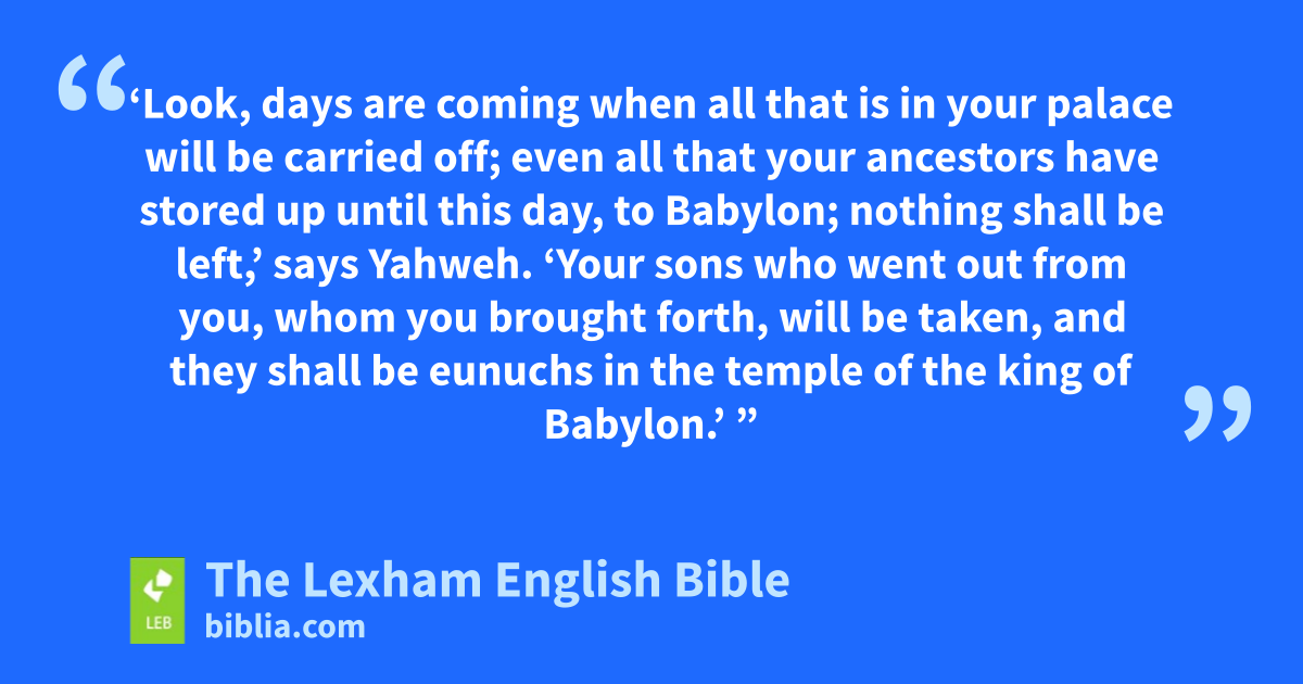 16 Then Isaiah said to Hezekiah, “Hear the word of Yahweh! 17 ‘Look, days are coming when all that is in your palace will be carried off; even all that your ancestorse have stored up until this day, to Babylon; nothing shall be left,’ says Yahweh. 18 ‘Your sons who went out from you, whom you brought forth, will be taken, and they shall be eunuchs in the temple of the king of Babylon.’ ” 19 Then Hezekiah said to Isaiah, “The word of Yahweh that you have spoken is good,” and he thought, “Is it not that peace and security shall be in my days?” 20 Now the remainder of the acts of Hezekiah, all of his powerful deeds, and how he made the pool and the conduit and brought the water into the city, are they not written in the scroll of the events of the days of the kings of Judah? 21 Then Hezekiah slept with his ancestors,f and Manasseh his son became king in his place.