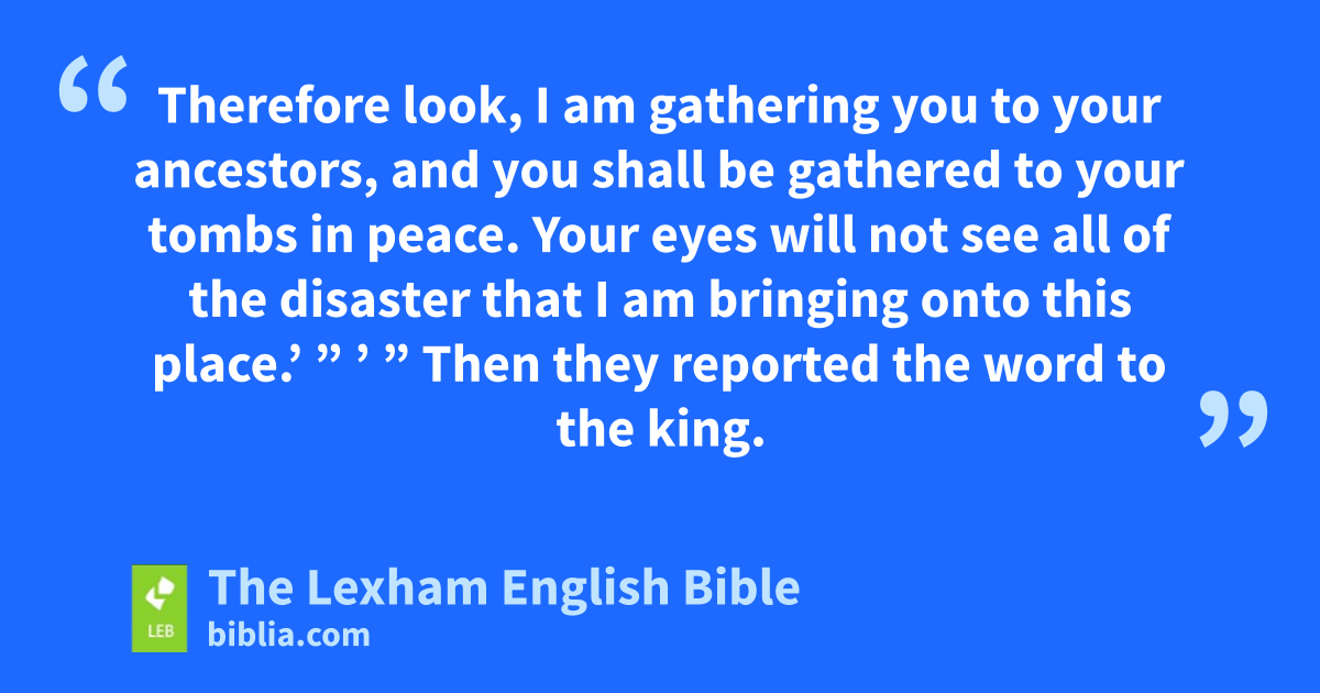 14 So Hilkiah the priest, Ahikam, Acbor, Shaphan, and Asaiah went to Huldah the prophetess, the wife of Shallum the son of Tikvah the son of Harhas, the keeper of the robes. Now she was living in Jerusalem in the second district. Then they spoke to her, 15 and she said to them, “Thus says Yahweh the God of Israel, ‘Say to the man who sent you to me, 16 “Thus says Yahweh, ‘Look I am bringing evil to this place and upon its inhabitants, according to all of the words of that scroll that the king of Judah has read 17 because they have abandoned me and they have burned incense to other gods, provoking me to anger with all of the works of their hands. My wrath shall be kindled against this place and not be quenched.’ ” 18 And to the king of Judah who sent all of you to inquire of Yahweh, thus you shall say to him, “Thus says Yahweh the God of Israel, ‘Concerning the words that you have heard, 19 because you have a responsive heart, and you humbled yourself before Yahweh when you heard how I spoke against this place and against its inhabitants to become a desolation and a curse, and you have torn your clothes and wept before my face, I have also heard, declares Yahweh. 20 Therefore look, I am gathering you to your ancestors,d and you shall be gathered to your tombs in peace. Your eyes will not see all of the disaster that I am bringing onto this place.’ ” ’ ” Then they ⌊reported the word⌋e to the king.