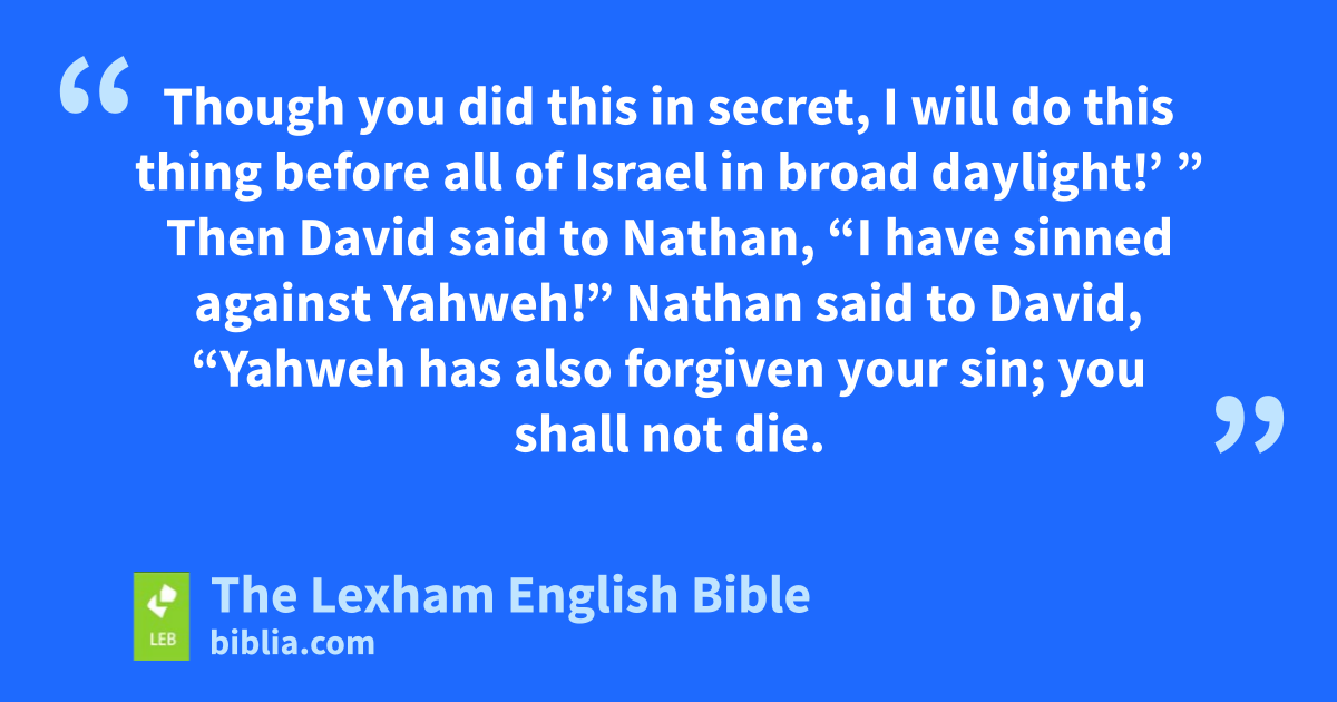 12 So Yahweh sent Nathan to David, and he came to him and said, “Two men were in a certain city; one was rich and the other was poor. 2 The rich man had very many flocks and herds, 3 but the poor man had nothing except for one small ewe lamb which he had bought. He had nurtured her, and she grew up with him and with his children together. She used to eat from his morsel and drink from his cup, and she used to lie in his lap and became like a daughter for him. 4 And a visitor came to the rich man, but he ⌊was reluctant⌋a to take from his flocks or from his herds to prepare a meal for the traveler when he came to him. So he took the ewe lamb of the poor man and prepared it for the man who had come to him.” 5 Then ⌊the anger of David was kindled⌋b against the man, and he said to Nathan, “⌊As Yahweh lives⌋,c the man who has done this ⌊deserves to die⌋!d 6 He shall restore the ewe lamb fourfold because he has done this thing, and because he had no pity.” 7 Then Nathan said to him, “You are the man! Thus says Yahweh the God of Israel: ‘I anointed you as king over Israel, and I delivered you from the hand of Saul. 8 I gave you the household of your master and the women of your master into your lap. I also gave you the house of Israel and Judah; if that had been too little, I would have added to you ⌊much more⌋.e 9 Why have you despised the word of Yahweh by doing evil in his eyes?f Uriah the Hittite you have struck down with the sword, and his wife you have taken to yourself as wife! You have killed him with the sword of the ⌊Ammonites⌋!g 10 So then, a sword will not turn away from your house forever, because you have despised me and have taken the wife of Uriah the Hittite to be your wife!’ 11 Thus says Yahweh, ‘Look, I am going to raise up evil against you from within your house, and I will take your women before your eyes, and I will give them to your neighbor, and he shall sleep with your wives ⌊in broad daylight⌋.h 12 Though you did this in secret, I will do this thing before all of Israel ⌊in broad daylight⌋!’ ”i