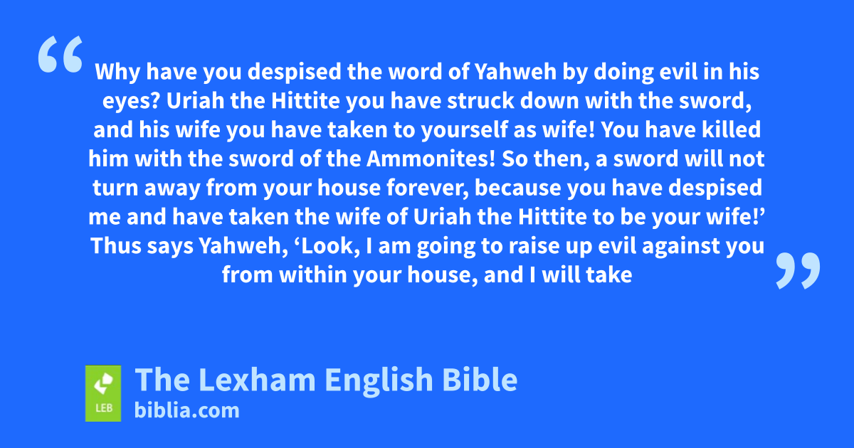 12 So Yahweh sent Nathan to David, and he came to him and said, “Two men were in a certain city; one was rich and the other was poor. 2 The rich man had very many flocks and herds, 3 but the poor man had nothing except for one small ewe lamb which he had bought. He had nurtured her, and she grew up with him and with his children together. She used to eat from his morsel and drink from his cup, and she used to lie in his lap and became like a daughter for him. 4 And a visitor came to the rich man, but he ⌊was reluctant⌋a to take from his flocks or from his herds to prepare a meal for the traveler when he came to him. So he took the ewe lamb of the poor man and prepared it for the man who had come to him.” 5 Then ⌊the anger of David was kindled⌋b against the man, and he said to Nathan, “⌊As Yahweh lives⌋,c the man who has done this ⌊deserves to die⌋!d 6 He shall restore the ewe lamb fourfold because he has done this thing, and because he had no pity.” 7 Then Nathan said to him, “You are the man! Thus says Yahweh the God of Israel: ‘I anointed you as king over Israel, and I delivered you from the hand of Saul. 8 I gave you the household of your master and the women of your master into your lap. I also gave you the house of Israel and Judah; if that had been too little, I would have added to you ⌊much more⌋.e 9 Why have you despised the word of Yahweh by doing evil in his eyes?f Uriah the Hittite you have struck down with the sword, and his wife you have taken to yourself as wife! You have killed him with the sword of the ⌊Ammonites⌋!g 10 So then, a sword will not turn away from your house forever, because you have despised me and have taken the wife of Uriah the Hittite to be your wife!’ 11 Thus says Yahweh, ‘Look, I am going to raise up evil against you from within your house, and I will take your women before your eyes, and I will give them to your neighbor, and he shall sleep with your wives ⌊in broad daylight⌋.h 12 Though you did this in secret, I will do this thing before all of Israel ⌊in broad daylight⌋!’ ”i