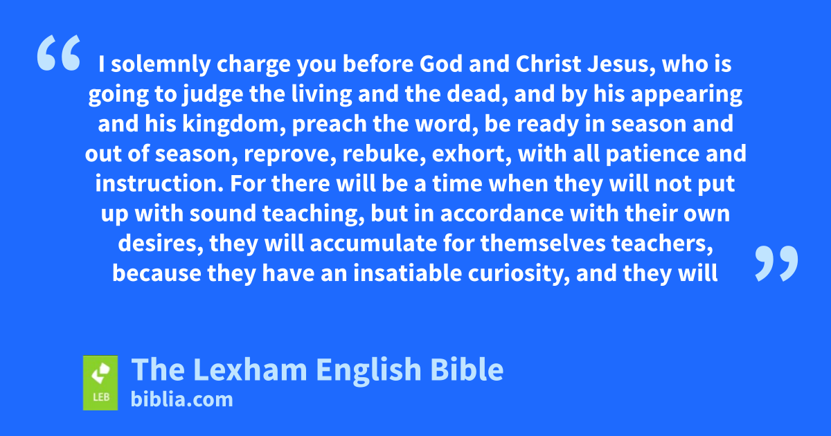 4 I solemnly charge you before God and Christ Jesus, who is going to judge the living and the dead, and by his appearing and his kingdom, 2 preach the word, be ready in season and out of season, reprove, rebuke, exhort, with all patience and instruction. 3 For there will be a time when they will not put up with sound teaching, but in accordance with their own desires, they will accumulate for themselves teachers, ⌊because they have an insatiable curiosity⌋a, 4 and they will turn away from the hearing of the truth, but will turn to myths. 5 But you, be self-controlled in all things, bear hardship patiently, do the work of an evangelist, fulfill your ministry.