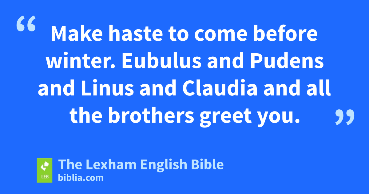 19 Greet Prisca and Aquila and the household of Onesiphorus. 20 Erastus remained in Corinth, but Trophimus I left behind in Miletus because he* was sick. 21 Make haste to come before winter. Eubulus and Pudens and Linus and Claudia and all the brothers greet you. 22 The Lord be with your spirit. Grace be with you.