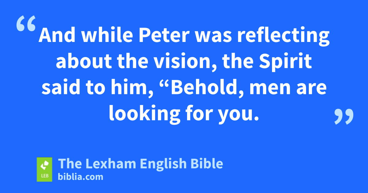 17 Now while Peter was greatly perplexed within himself as to what the vision that he had seen might be, behold, the men who had been sent by Cornelius, having found the house of Simon by asking around, stood at the gate. 18 And they called out and* asked if Simon who was also called Peter was staying there as a guest. 19 And while* Peter was reflecting about the vision, the Spirit said to him, “Behold, mend are looking for you. 20 But get up, go down, and go with them—not hesitating at all, because I have sent them.” 21 So Peter went down to the men and* said, “Behold, I am he whom you are looking for! What is the reason for which you have come?” 22 And they said, “Cornelius, a centurion, a righteous and God-fearing man—and well spoken of by the whole nation of the Jews—was directed by a holy angel to summon you to his house and to hear words from you.” 23 So he invited them in and* entertained them as guests, and on the next day he got up and* went away with them. And some of the brothers from Joppa accompanied him. 24 And on the next day he entered into Caesarea.