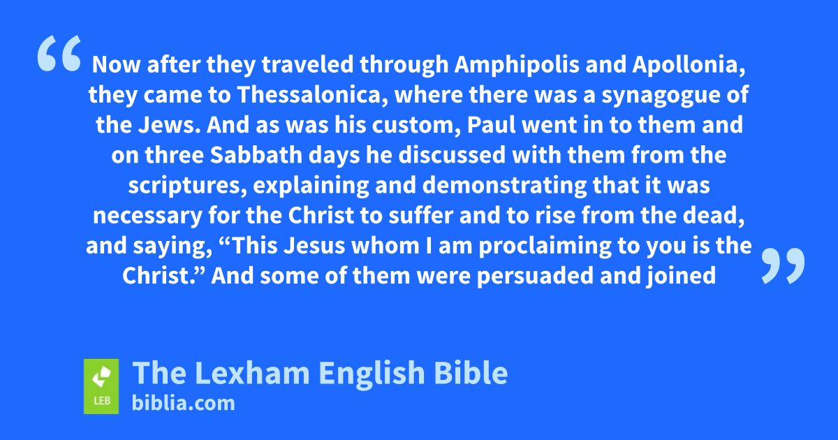 17 Now after they* traveled through Amphipolis and Apollonia, they came to Thessalonica, where there was a synagogue of the Jews. 2 ⌊And as was his custom⌋,a Paul went in to them and on three Sabbath days he discussed with them from the scriptures, 3 explaining and demonstrating that it was necessary for the Christb to suffer and to rise from the dead, and saying, “This Jesus whom I am proclaiming to you is the Christ.”c 4 And some of them were persuaded and joined Paul and Silas, and also a large number of God-fearing Greeks and not a few of the prominent women.