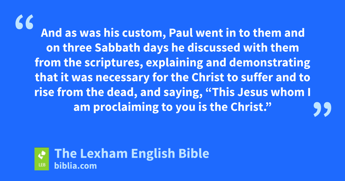 17 Now after they* traveled through Amphipolis and Apollonia, they came to Thessalonica, where there was a synagogue of the Jews. 2 ⌊And as was his custom⌋,a Paul went in to them and on three Sabbath days he discussed with them from the scriptures, 3 explaining and demonstrating that it was necessary for the Christb to suffer and to rise from the dead, and saying, “This Jesus whom I am proclaiming to you is the Christ.”c 4 And some of them were persuaded and joined Paul and Silas, and also a large number of God-fearing Greeks and not a few of the prominent women.