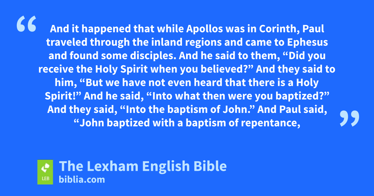 19 And it happened that while Apollos was in Corinth, Paul traveled through the inland regions and* camea to Ephesus and found some disciples. 2 And he said to them, “Did you receive the Holy Spirit when you* believed?” And they said to him, “But we have not even heard that there is a Holy Spirit!” 3 And he said, “Into what then were you baptized?” And they said, “Into the baptism of John.” 4 And Paul said, “John baptized with a baptism of repentance, telling the people that they should believe in the one who was to come after him—that is, in Jesus.” 5 And when they* heard this,* they were baptized in the name of the Lord Jesus. 6 And when* Paul laid handsb on them, the Holy Spirit came upon them and they began to speak* in tongues and to prophesy. 7 (Now the total number of men was about twelve.)