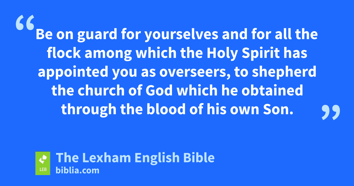 25 “And now behold, I know that all of you, among whom I went about proclaiming the kingdom, will see my face no more. 26 Therefore I testify to you on this very day that I am guiltless of the blood of all of you,* 27 for I did not shrink from proclaiming to you the whole purpose of God. 28 Be on guard for yourselves and for all the flock among which the Holy Spirit has appointed you as overseers, to shepherd the church of God which he obtained through the blood of his own Son.h 29 I know that after my departure fierce wolves will come in among you, not sparing the flock. 30 And from among you yourselves men will arise, speaking ⌊perversions of the truth⌋i in order to draw away the disciples after them. 31 Therefore be on the alert, remembering that night and day for three years I did not stop warning each one of you* with tears.
