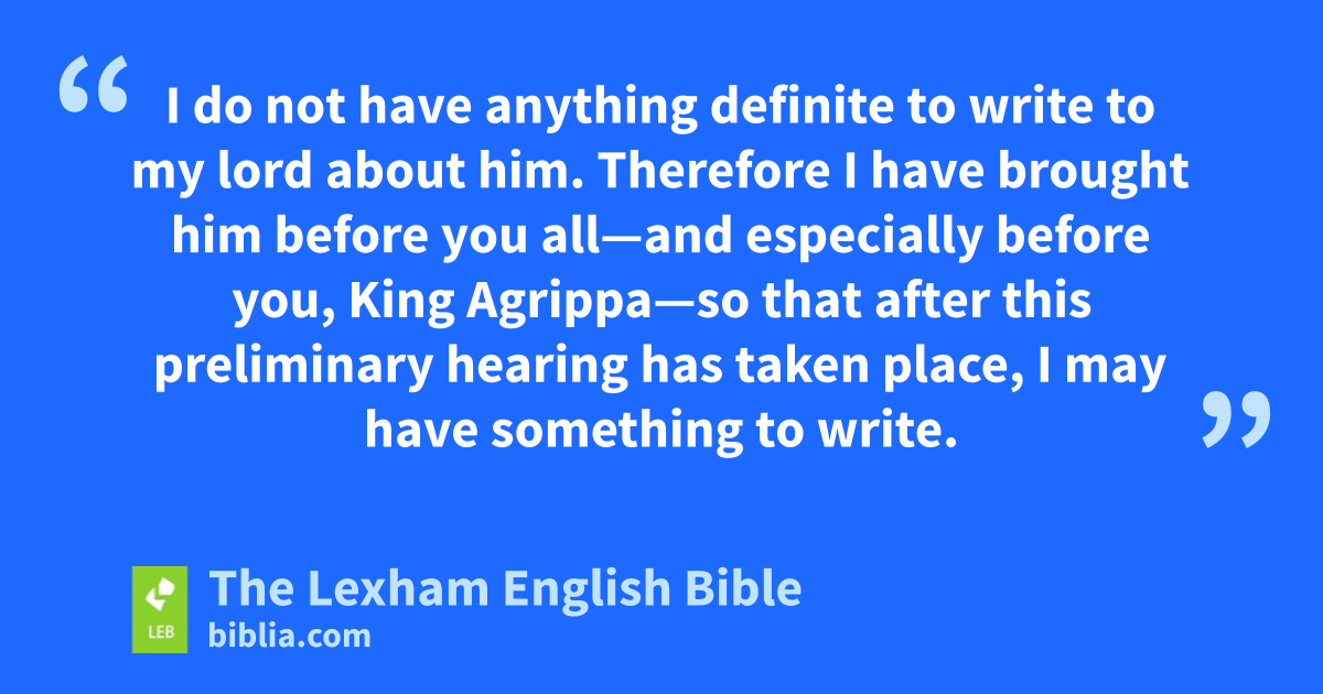 23 So on the next day, Agrippa and Bernice came with great pageantry and entered into the audience hall, along with military tribunes and the most prominent men of the city. And when* Festus gave the order, Paul was brought in. 24 And Festus said, “King Agrippa and all who are present with us, you see this man about whom the whole population of the Jews appealed to me, both in Jerusalem and here, shouting that he must not live any longer. 25 But I understood that he had done nothing deserving death himself, and when* this man appealed to His Majesty the Emperor, I decided to send him.* 26 I do not have anything definite to write to my* lord about ⌊him⌋.d Therefore I have brought him before you all*—and especially before you, King Agrippa—so that after* this preliminary hearing has taken place, I may have something to write. 27 For it seems unreasonable to me to send a prisoner and not to indicate the charges against him.”