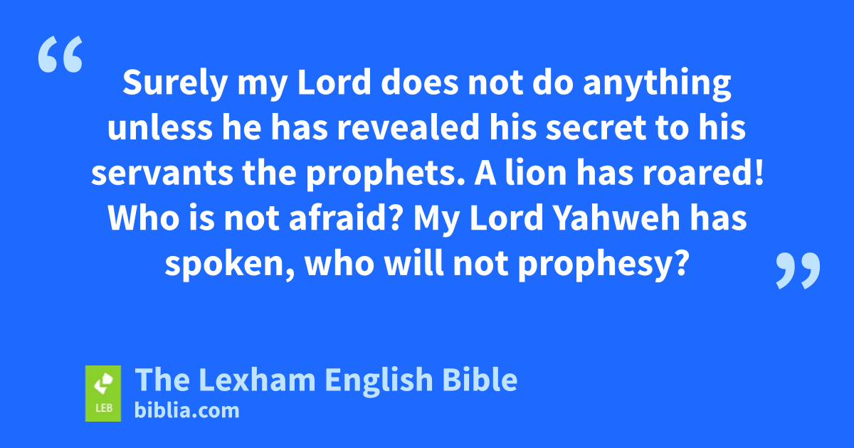3 Hear this word that Yahweh has spoken against you, O people of Israel, against the whole clan that I brought up from the land of Egypt:a 2 “You only have I ⌊chosen⌋b of all the clans of the earth. Therefore I will punish you for all your iniquities. 3 Do two walk together unless they have met? 4 Does a lion roar in the forest ⌊when he has no prey⌋?c Does a fierce, young lion cry out from his den unless he has caught something? 5 Does a bird fall into a trapping net on the earth when there is no snare for it? Does a trapping net spring up from the ground unless it has certainly caught something? 6 Or is a horn blown in a city and people are not afraid? Or does a disaster occur in the city and Yahweh has not done it? 7 Surely my Lord does not do anything unless he has revealed his secret to his servants the prophets. 8 A lion has roared! Who is not afraid? My Lord Yahweh has spoken, who will not prophesy? 9 Proclaim to the citadel fortresses in Ashdod and the citadel fortresses in the land of Egypt and say: “Gather on the mountains of Samaria and see the great panic in her midst and the oppression in her midst!” 10 “They do not know how to do right,” ⌊declares Yahweh⌋,d “those who store up violence and destruction in their citadel fortresses.” 11 Therefore, thus says my Lord Yahweh, “A foe shall surround the land and bring down your strongholds, and your citadel fortresses shall be plundered.” 12 Thus says Yahweh, “Just as the shepherd rescues two legs or a piece of an ear from the mouth of the lion, so shall the ⌊people⌋e of Israel who dwell in Samaria, with the corner of a couch and the damask of a bed.” 13 “Listen and testify against the house of Jacob,” ⌊declares⌋f my Lord Yahweh, the God of hosts. 14 “For on the day I punish Israel for ⌊its transgression⌋,g I will also punish the altars of Bethel and the horns of the altar will be cut off and fall to the ground. 15 I will ruin the winter house as well as the summer house, and the houses of ivory will perish and the great houses shall come to an end,” ⌊declares⌋h Yahweh.