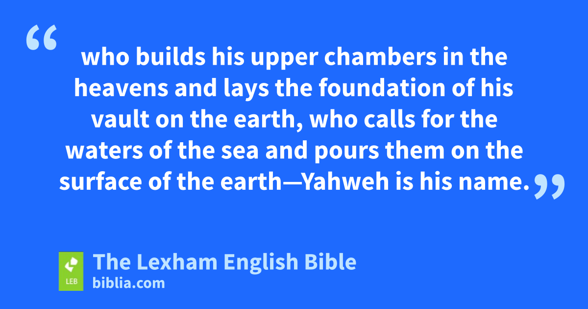 9 I saw my Lord standing by the altar and he said, “Strike the capitals so that the thresholds will shake, and shatter them on the head of all of them, and I will kill the rest of them with the sword. A fugitive belonging to them will not run away, and a survivor belonging to them will not escape. 2 If they dig into Sheol, from there my hand will take them, and even if they climb up to heaven, from there I will bring them down. 3 And even if they hide themselves on the top of Carmel, from there I will search and will take them, and even if they hide from before my eyes at the bottom of the sea, from there I will command the sea serpent and it will bite them. 4 And even if they go into captivity before their enemies, from there I will command the sword and it will kill them, and I will fix my eyes on them for harm and not for good.” 5 And thus will do the Lord Yahweh of hosts, who touches the earth and it melts, and all of those living in it mourn, and all of it rises like the Nile and it sinks down like the Nile of Egypt, 6 who builds his upper chambers in the heavens and lays the foundation of his vault on the earth, who calls for the waters of the sea and pours them on the surface of the earth—Yahweh is his name. 7 “Are you not like the Cushites to me, O people of Israel?” ⌊declares⌋a Yahweh. “Did I not bring up Israel from the land of Egypt and the Philistines from Caphtor and ⌊the Arameans⌋b from Kir? 8 Look, the eyes of my Lord Yahweh are on the kingdom of sin, and I will destroy it from the surface of the earth. However, I will not utterly destroy the house of Jacob,” ⌊declares⌋c Yahweh. 9 “Yes, look, I am going to command and I will shake the house of Israel among all the nations like one who shakes with a sieve, but not a pebble will fall to the ground. 10 All the sinners of my people will die by the sword, who say, ‘Evil will not overtake or confront us.’