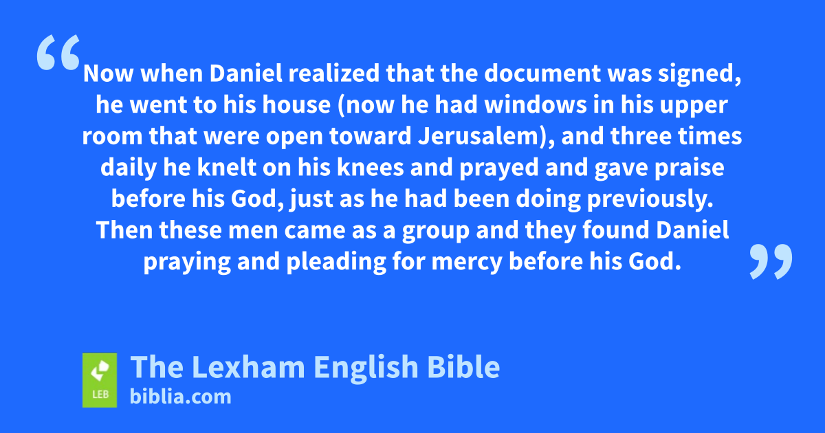 9 ⌊So⌋r the king, Darius, signed the writing and the interdict.s 10 Now ⌊when⌋t Daniel realized that the document was signed, he went to his house (⌊now he had windows in his upper room that were open⌋u toward Jerusalem), and three times ⌊daily⌋v he knelt on his knees and prayed and gave praise before his God, ⌊just as⌋w he had been doing ⌊previously⌋.x 11 Then these men came as a group and they found Daniel praying and pleading for mercy before his God. 12 Then they approached ⌊and spoke with the king⌋y concerning the edict of the king, “⌊Did you not sign an edict⌋z that any person who would seek anything from any God or human within thirty days except from you, O king, would be thrown into ⌊the lion pit⌋?”a The king answered and said, “The matter as you have just stated is certain according to the law of the Medes and Persians which cannot be revoked.”