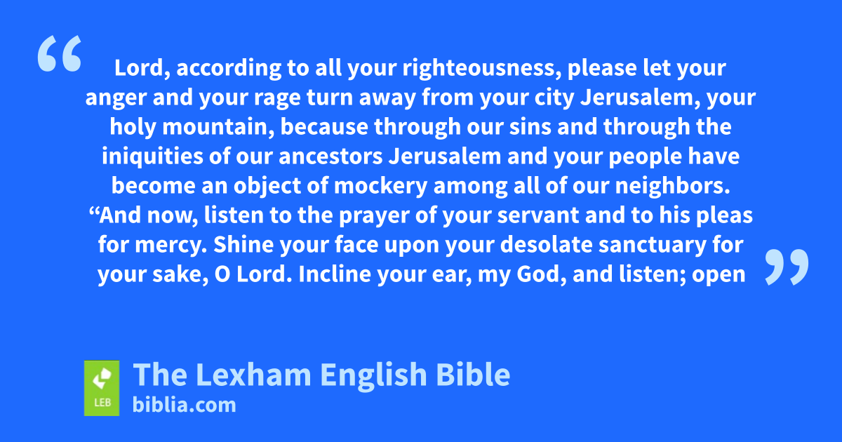 15 “And now, Lord our God, who have brought your people out from the land of Egypt with a strong hand, and you have made for yourself a name until this day—we have sinned, we have acted wickedly. 16 Lord, according to all your righteousness, please let your anger and your rage turn away from your city Jerusalem, ⌊your holy mountain⌋,n because through our sins and through the iniquities of our ancestorso Jerusalem and your people have become an object of mockery among all of our neighbors.