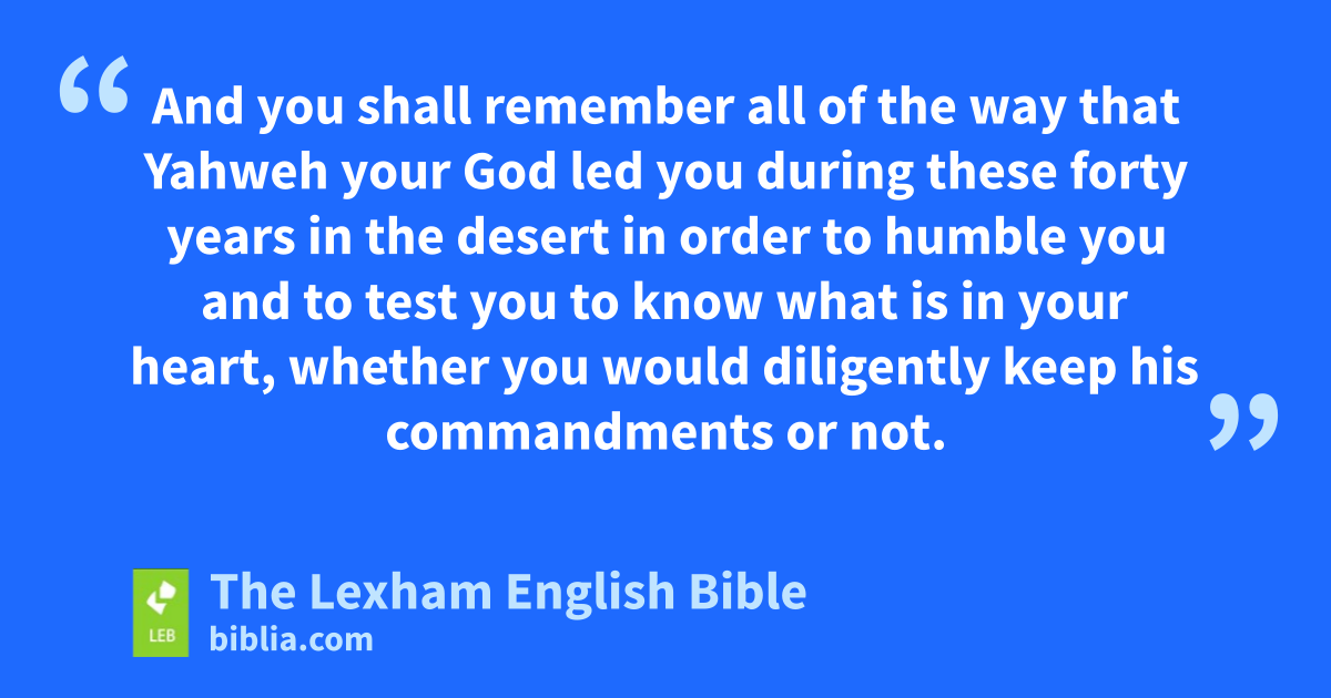 8 “All of the commandmentsa that I am commanding you today you must diligently observe, so that you may live and multiply, and you may go and take possession of the land that Yahweh swore to your ancestors.b 2 And you shall remember all of the way that Yahweh your God led you during these forty years in the desert in order to humble you and to test you to know what is in your heart, whether you would diligently keep his commandments or not. 3 And he humbled you and let you go hungry, and then he fed you with that which you did not know nor did your ancestorsc know, in order to make you know that not by bread alone but by all that goes outd of the mouth of Yahweh humankind shall live. 4 Your clothing did not wear out ⌊on you⌋,e and your feet did not swell during these forty years. 5 And you should know with your heart that as a man disciplines his son, so Yahweh your God is disciplining you.f 6 So you must keep the commandments of Yahweh your God by walking in his ways and by fearing him. 7 For Yahweh your God is bringing you to a good land with streams of water, springs and underground water, welling up in the valleysg and in the hills,h 8 to a land of wheat and barley and vinesi and fig treesj and pomegranate trees,k a land of olive trees,l olive oil and honey; 9 to a land where you may eat food in it ⌊without scarcity⌋;m you will not find anything lacking in it, a land where its stones are iron and from its mountains you can mine copper. 10 And you will eat, and ⌊you will be satisfied⌋,n and you will bless Yahweh your God because of the good land that he has given to you.