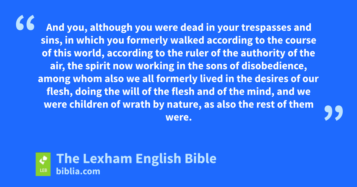 2 And you, ⌊although you were dead⌋a* in your trespasses and sins, 2 in which you formerly walked according to the course of this world, according to the ruler of the authority of the air, the spirit now working in the sons of disobedience, 3 among whom also we all formerly lived in the desires of our flesh, doing the willb of the flesh and of the mind, and we were children of wrathc by nature, as also the rest of them were.