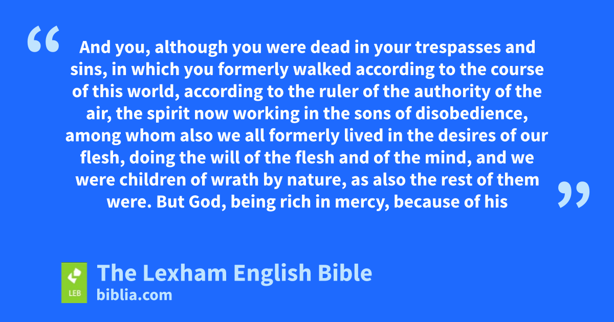 2 And you, ⌊although you were dead⌋a* in your trespasses and sins, 2 in which you formerly walked according to the course of this world, according to the ruler of the authority of the air, the spirit now working in the sons of disobedience, 3 among whom also we all formerly lived in the desires of our flesh, doing the willb of the flesh and of the mind, and we were children of wrathc by nature, as also the rest of them were.