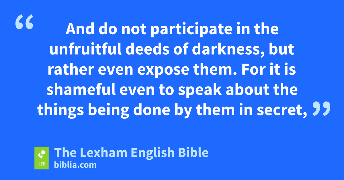 7 Therefore do not be sharersc with them, 8 for you were formerly darkness, but now you are light in the Lord. Live like children of light 9 (for the fruit of the light is in all goodness and righteousness and truth), 10 trying to learn what is well-pleasing to the Lord. 11 And do not participate in the unfruitful deeds of darkness, but rather even expose them. 12 For it is shameful even to speak about the things being done by them in secret, 13 but all things exposed by the light are made visible, 14 for everything made visible is light. Therefore it says,