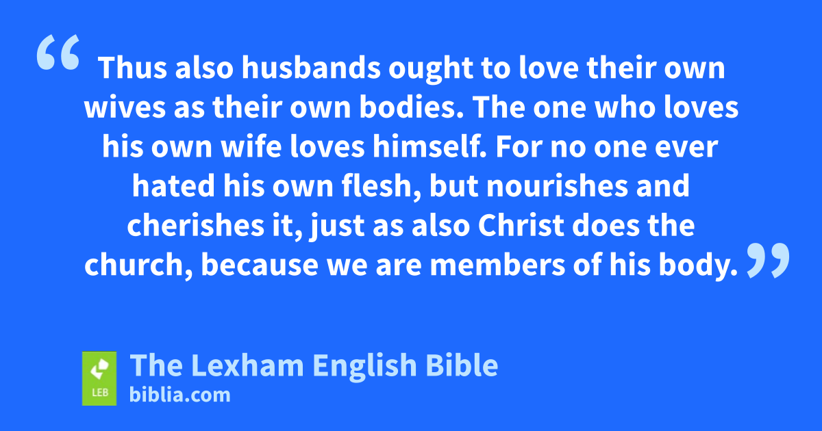 25 Husbands, love your wives, just as Christ also loved the church, and gave himself for her; 26 in order that he might sanctify her by cleansing her* with the washing of water by the word; 27 in order that he might present to himself the church glorious, not having a spot or wrinkle or any such thing, but that she may be holy and blameless. 28 Thus also husbands ought to love their own wives as their own bodies. The one who loves his own wife loves himself. 29 For no one ever hated his own flesh, but nourishes and cherishes it, just as also Christ does the church, 30 because we are members of his body. 31 “For this reason a man will leave his father and mother and be joined to his wife, and the two will become one flesh.”f 32 (This mystery is great, but I am speaking with reference to Christ and the church.) 33 Only you also, each one of you, must thus love his own wife as himself, and the wife ⌊must respect⌋g her husband.