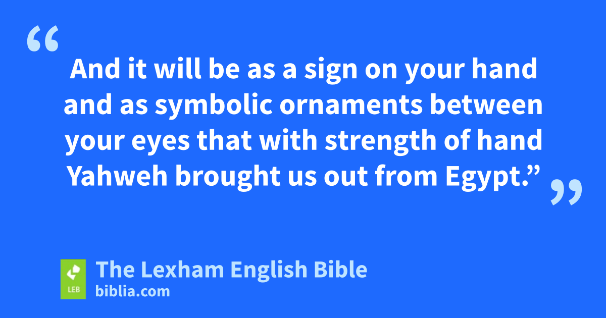 11 “And when Yahweh brings you to the land of the Canaanite, as he swore to you and to your ancestors,l and he gives it to you, 12 you will hand over every first offspring of a womb to Yahweh, and every first offspring dropped by a domestic animal that will belong to you, the males will be for Yahweh. 13 And every first offspring of a donkey you will redeem with small livestock, and if you will not redeem it, then you will break its neck, and every firstborn human among your sons you will redeem. 14 And when your son asks you ⌊in the future⌋,m saying, ‘What is this?’ you will say to him, ‘With strength of hand Yahweh brought us out from Egypt, from a house of slaves. 15 And when Pharaoh was stubborn to release us, Yahweh killed every firstborn in the land of Egypt, from firstborn human to firstborn domestic animal. Therefore I am sacrificing to Yahweh every first offspring of a womb, the males, and every firstborn of my sons I redeem.’ 16 And it will be as a sign on your hand and as symbolic ornaments between your eyes that with strength of hand Yahweh brought us out from Egypt.”