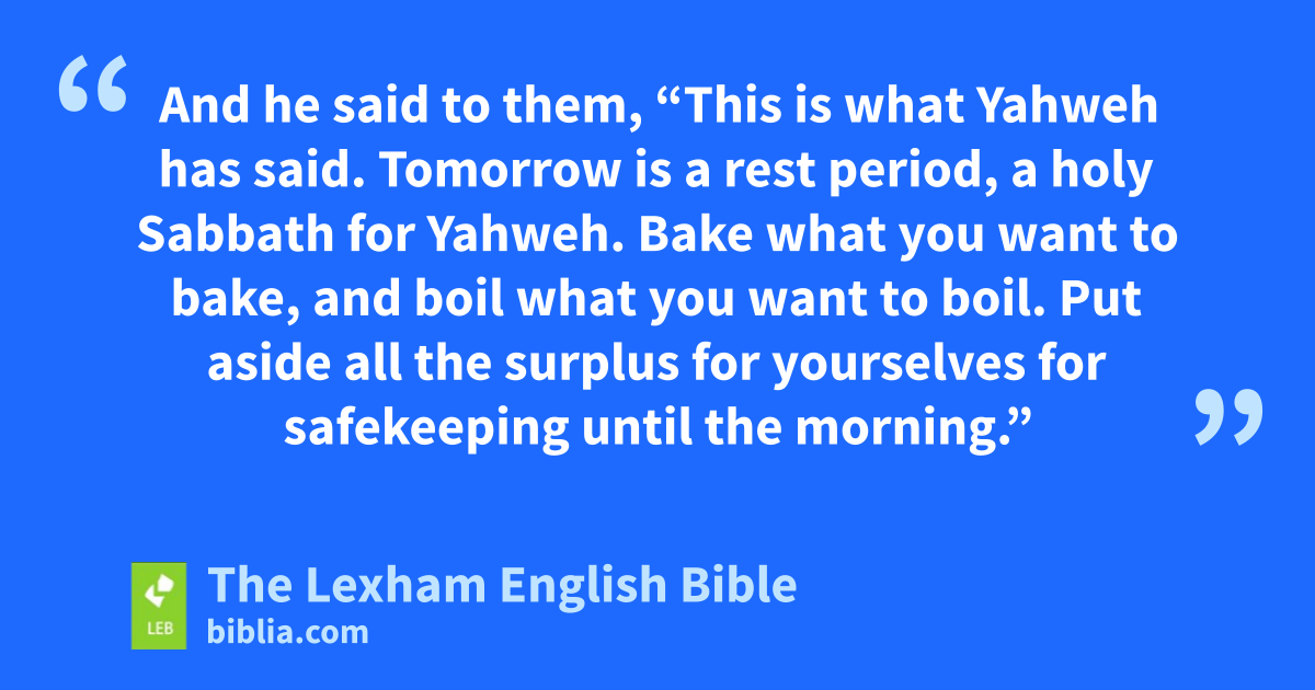 22 And when it was the sixth day, they gathered twice as much bread, two omers for one person, and all the leaders of the community came and told Moses. 23 And he said to them, “This is what Yahweh has said. Tomorrow is a rest period, a holy Sabbath for Yahweh. Bake what you want to bake, and boil what you want to boil. Put aside all the surplus for yourselves for safekeeping until the morning.” 24 And they put it aside until the morning, as Moses had commanded, and it did not make a stench, and not a maggot was in it. 25 And Moses said, “Eat it today, because today is a Sabbath for Yahweh. Today you will not find it in the field. 26 Six days you will gather it, but on the seventh day, the Sabbath, it will not be present on it.”