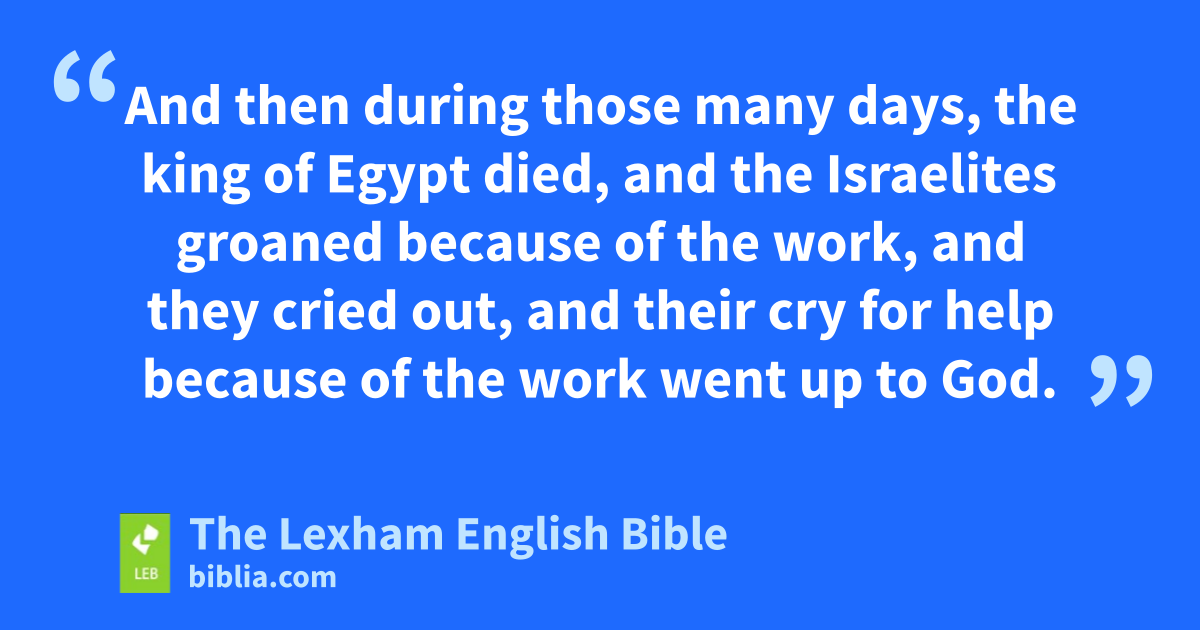 23 ⌊And then⌋o during those many days, the king of Egypt died, and the ⌊Israelites⌋p groaned because of the work, and they cried out, and their cry for help because of the work went up to God. 24 And God heard their groaning, and God remembered his covenant with Abraham, with Isaac, and with Jacob, 25 and God saw the ⌊Israelites⌋,q and God took notice.r
